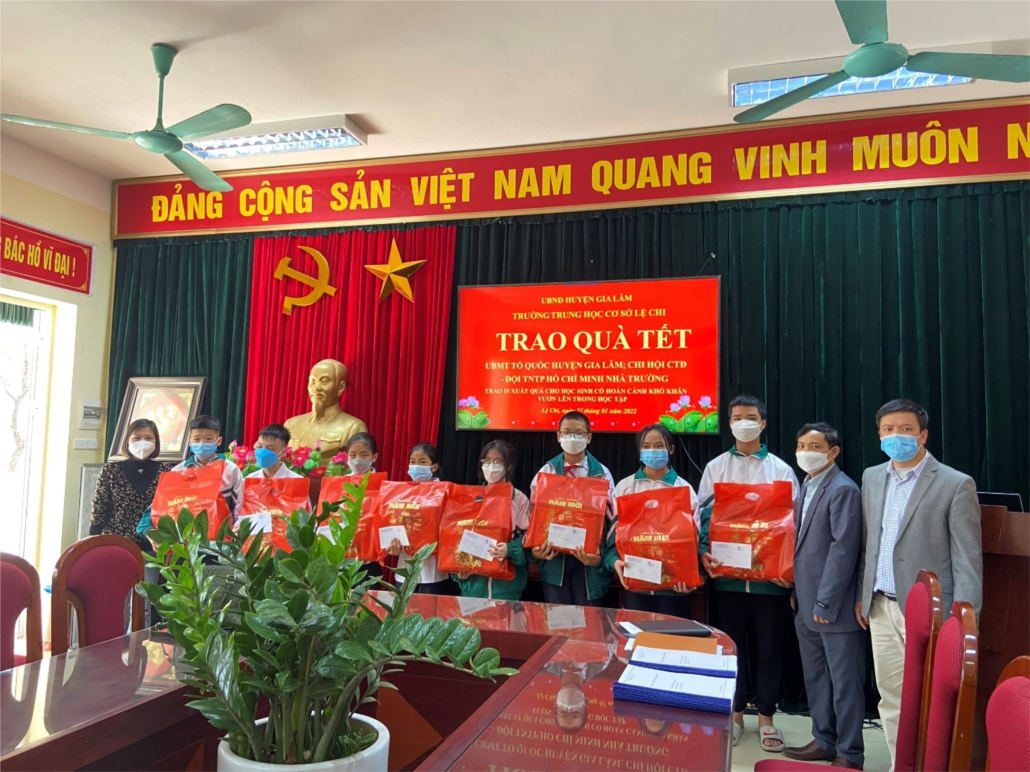 Thấu hiểu với những hoàn cảnh khó khăn, với mong muốn các con học sinh ai ai cũng được đón tết đủ đầy, hạnh phúc, UBMT Tổ quốc huyện Gia Lâm, Chi hội Chữ thập đỏ - Đội TNTP Hồ Chí Minh trường THCS Lệ Chi đã trao tặng 15 xuất quà cho các học sinh có hoàn cảnh khó khăn vươn lên trong học tập. Món quà nhỏ - ý nghĩa lớn! Với những yêu thương được đón nhận từ các cấp lãnh đạo, các con và gia đình sẽ có một mùa xuân yêu thương, một cái Tết đầm ấm, sum vầy.