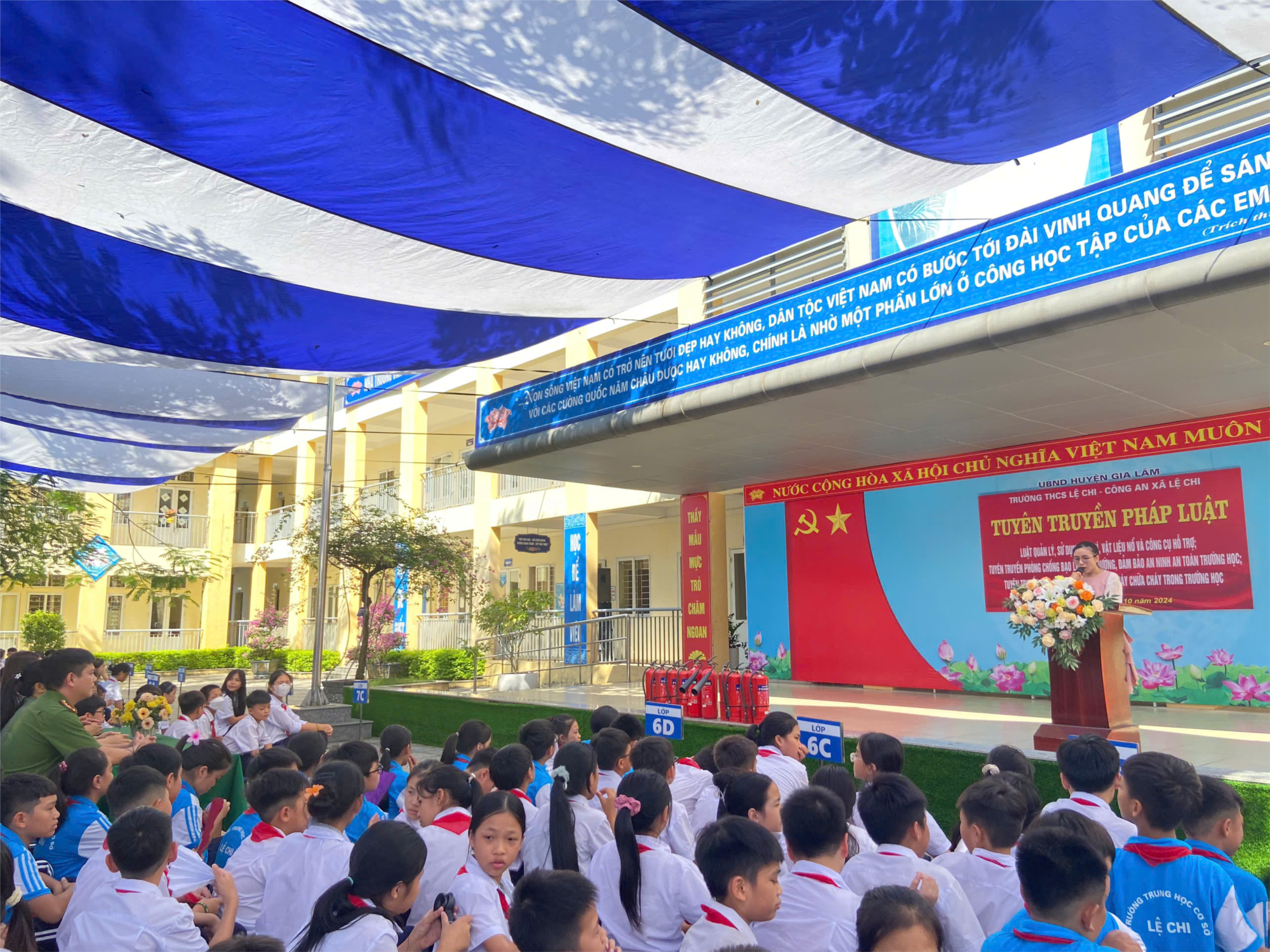 Đến dự buổi tuyên truyền có các đồng chí: Thiếu tá Đỗ Thu Hà – Chuyên viên công an Huyện Gia Lâm, báo cáo viên; đồng chí Đinh Thị Liên – Đảng ủy viên, Phó chủ tịch UBND xã Lệ Chi; đồng chí Nguyễn Đức Tài – Phó trưởng công an xã Lệ Chi; ban đại diện CMHS trường, cùng toàn thể các đồng chí cán bộ, giáo viên, nhân viên và hơn 800 học sinh trường THCS Lệ Chi.